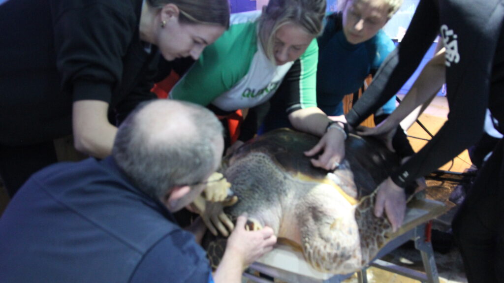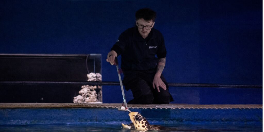 An aquarist who has spent the morning testing the water chemistry, fixing filtration pumps, preparing specialised diets, noting and logging animal behaviour, caring for the sick, settling in the new arrivals, and trying to persuade a stubborn turtle away from a filter intake…and wow, is that turtle stubborn!